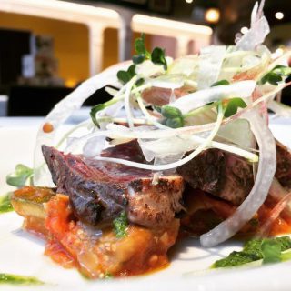 マリネしておいて、薄くスライスした赤玉ねぎと、下にはキンキンに冷えたカポナータを敷いております。初秋の食材である鰹は赤身のお魚。ロゼでも白ワインでも良いペアリングを果たしてくれます。