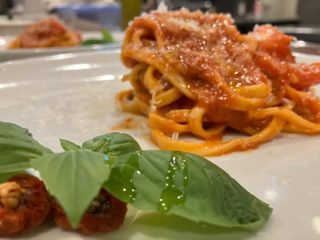 手打ちのタリアテッレのパスタでバジリコとトマトソースのシンプルなものですが、トマトソースを作り込むととても美味しくなるので、皆様にお出し致しました。