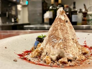 外側には生クリームで。和訳すると白い山ですが、まるで雪が降り注いだ山に見立てたドルチェ。良い感じに仕上がっています。